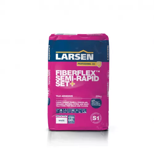 Larsen FiberFlex Semi-Rapid Set+ is a specially formulated, fully flexible, S1 rated, microfibre reinforced, non-slip, cement-based adhesive. It is suitable for large format panels, porcelain, ceramic, and natural stone tiles. It is suitable for beds of 3-20mm, interior, exterior, floor, and wall applications.