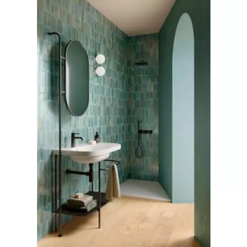 Super-glossy concave and convex surfaces combined with three-dimensional structures alternate on the walls, bringing them to life. A palette of five colours, Bianco, Beige, Turchese, Giada and Grigio, available in three different sizes – 10x10 cm, 5x15 cm and 7.5x20 cm –, modular and with straight edges, for new installation options.