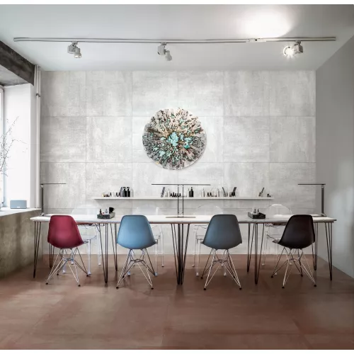 The passage of time is the central theme of time-worn surfaces which gradually reveal all their genuine wonder, in daring contrasts between matter and light. Four contemporary colour shades interpret the unique beauty of metals and define different moods with a distinctive personality. A free style, suitable for every context, inspires unusual applications for original living spaces, inside and outside the home. The unique iridescence of metals finds full expression in the new large sizes, 120x120 and 60x120 cm, in the 6 mm slimline thickness, alongside the 75x150, 75x75, 60x60 and 30x60 cm rectified sizes and an elegant set of tone-on-tone decors.
