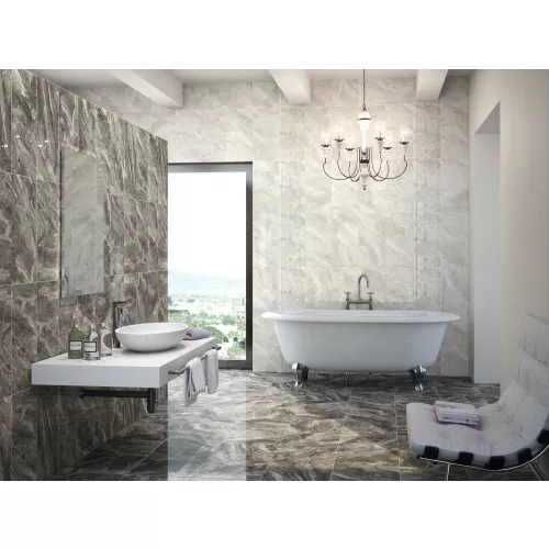 A fresh and cool polished porcelain tile inspired by white marble. Striking silver tones blended in with smooth white make this tile clean, modern and fresh looking. The fact that it's porcelain means it is durable and long-lasting.