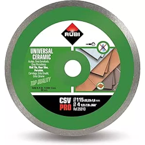 The RUBI CSV‑115 PRO (25910) continuous rim diamond blade is designed for dry cutting ceramic tiles with an angle grinder. As a versatile, general‑purpose tile‑cutting blade, the CSV PRO is ideal for installers who work with a wide variety of ceramic materials and need consistent, high‑quality results without constantly changing blades.