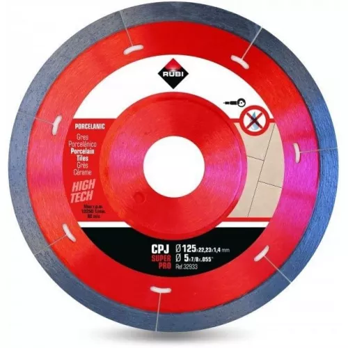 The RUBI CPJ‑125 SUPERPRO (32933) J‑Slot diamond blade is engineered for cutting very hard porcelain tiles with maximum speed, precision and stability. Designed for professional ceramic tile installers, the CPJ SUPERPRO delivers fast, clean straight cuts while reducing internal stress during cutting—making it ideal for today’s dense, high‑performance porcelain materials.