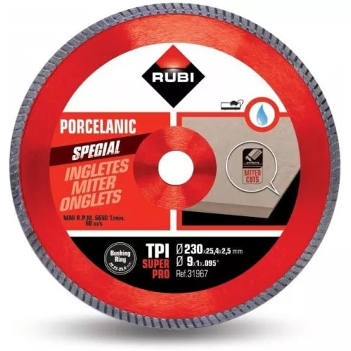 The RUBI TPI‑230 SUPERPRO (31967) diamond blade is a specialised, high‑performance tool designed exclusively for mitre cutting porcelain stoneware tiles. Built for professional ceramic tile installers, the TPI SUPERPRO delivers exceptional stability, cutting speed and finish quality—ideal for achieving flawless mitres on modern porcelain materials.